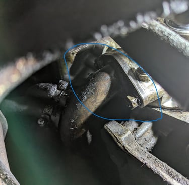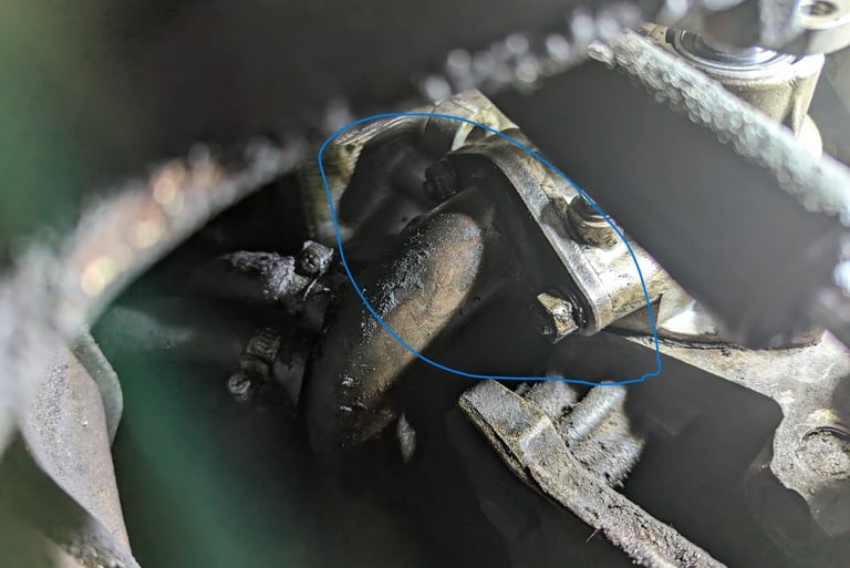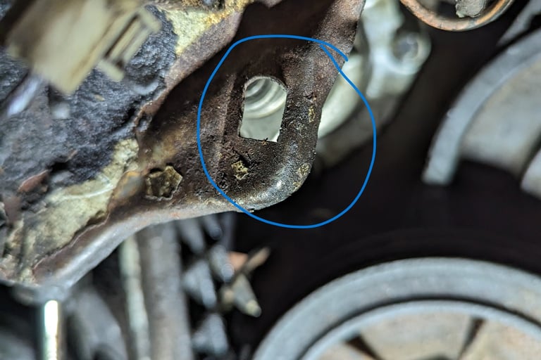 The water rail nuts were covered in stubborn gunk and they were the next things to be removed. There is a rubbery panel from which the track rod end for the steering comes out into the wheel arch and I pushed that back and gained access to the nuts (shown circled in image below) which were removed with some patience and more expletives.