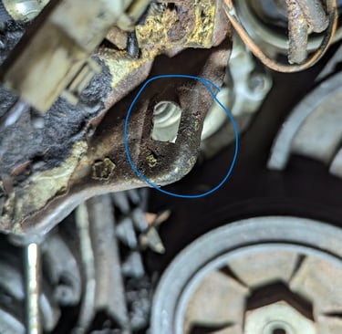 I put a shallow 1/4 socket onto the water pump pulley bolt and then connected that to a 1/4 extension bar through the circled hole ( which is intended to hold a plastic insert into which the metal cover screws ) with various adapters and extension bars to connect with a 1/2 ratchet. Having sprayed lots of WD40 on the offending bolt, I then used a pry bar to stop the pulley from spinning while loosening each of the three bolts one at a time. You will need to spin the pulley around to move each of the bolts to view through the hole until all three are loosened.