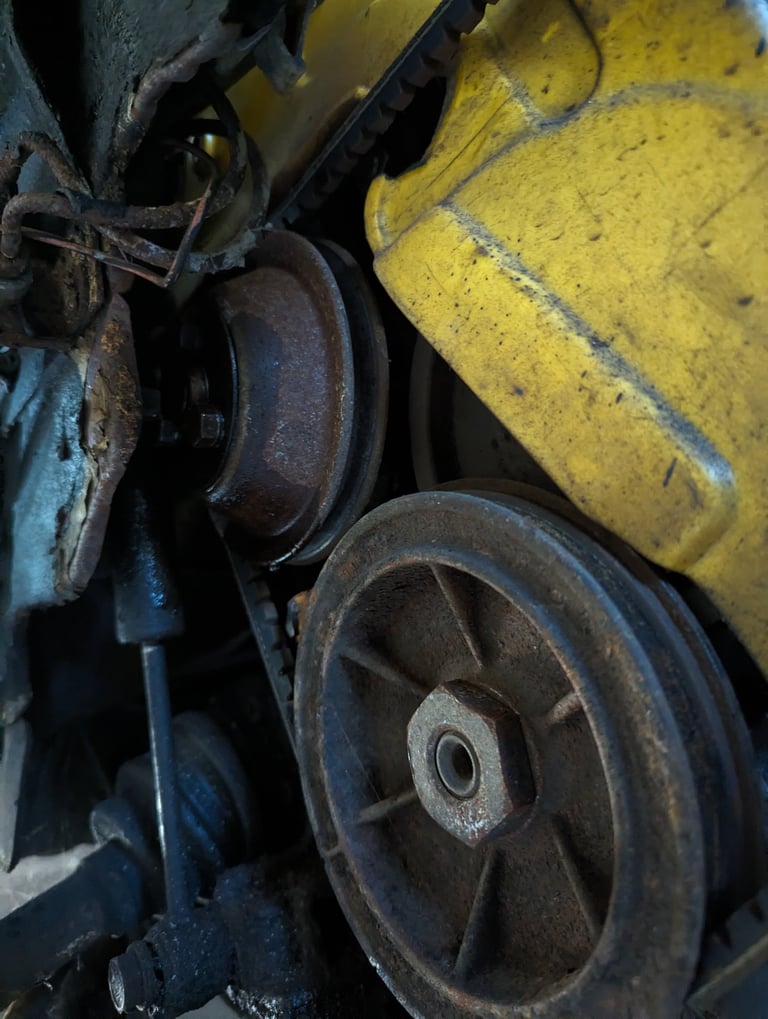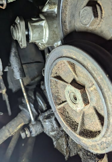 I started by removing belt cover bolts and then removed the driver side metal cover which was covered in probably more than two decades of gunk. With the cover from the wheel arch removed I was able to access the water pump and pulley.