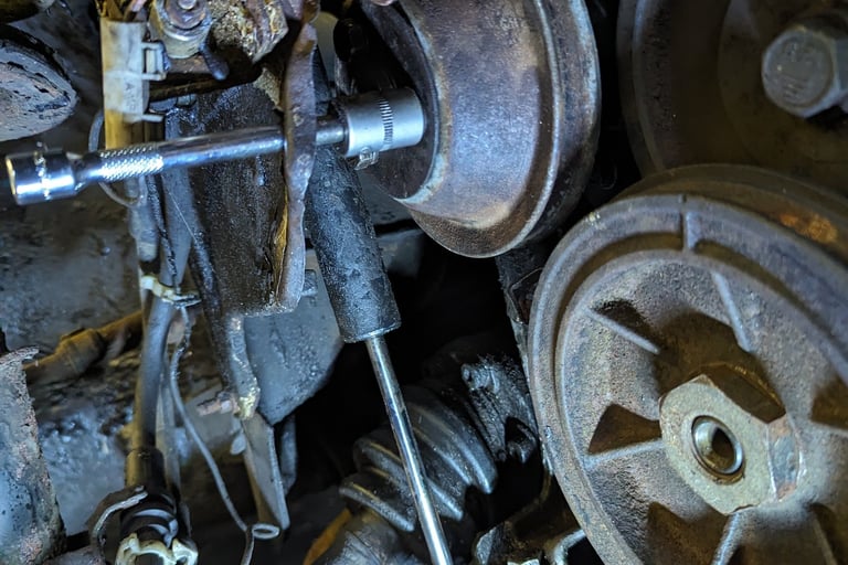 There is also the vibration damper connected just in front of the water pump, this was loosened to allow a few more millimetres of space for a ratchet.