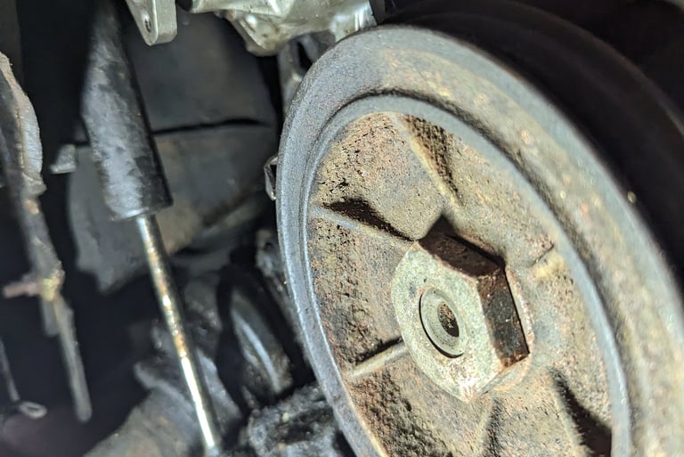 Then with the prybar in place to stop rotation I got all three bolts out and with some gentle persuasion from my hammer the pulley was off.